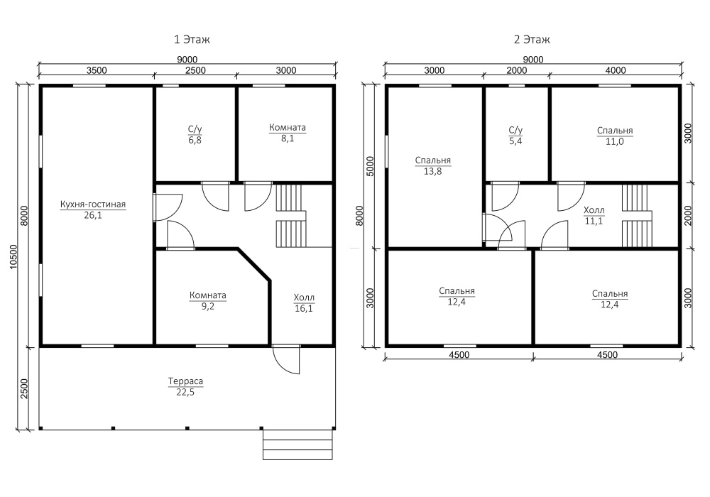 Популярные размеры: мини - до 50м2 (чаще всего, 1-этажные дома); компактные - от 70м2 до 100 квадратов (обычно двухэтажные); большие - от 150 м2 и больше.