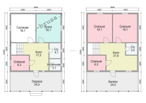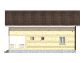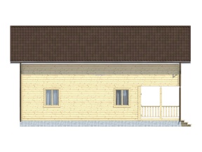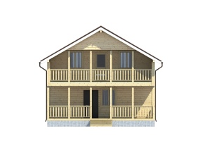 Главная отличительная черта дома – балконом и большой террасой. Тип крыши: двускатная с покрытием из ондулина красного, зеленого или коричневого цвета. Окна двойные зимние со стеклами 1x1,2 м. Двери межкомнатные филенчатые (0,8x2,0 м). Количество окон, дверей может меняться согласно предпочтениям заказчика.